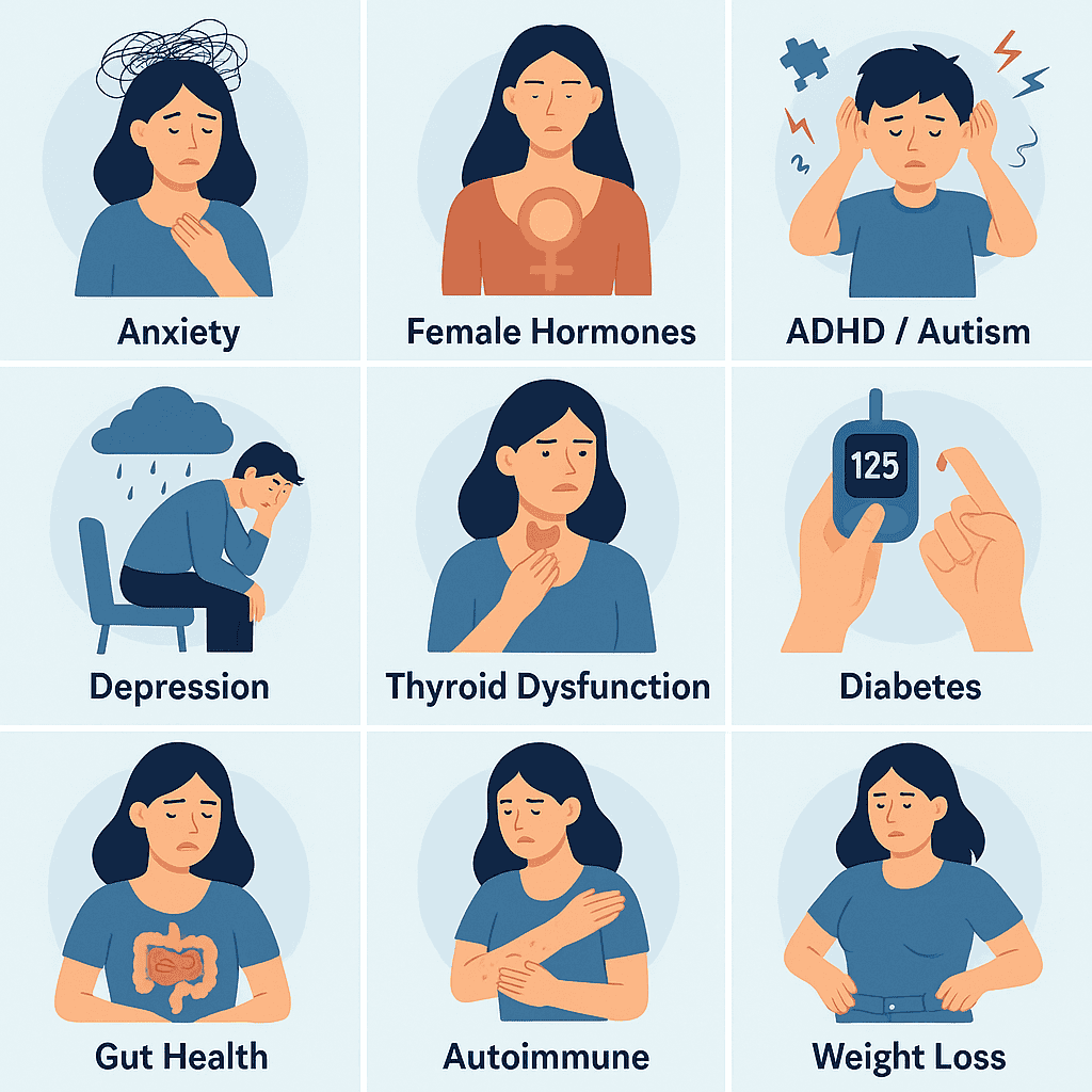 We order targeted, evidence-informed lab testing to look for root causes, not shotgun testing. Examples we commonly use: